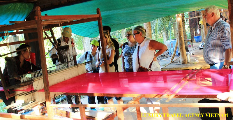 Don’t be misled by other companies’ descriptions of peaceful islands at these destinations. Neither are islands, and both are busy landing stages for nearly all of the many tour boats plying the Mekong. Nevertheless, they are worth visiting to look at examples of the local culture.