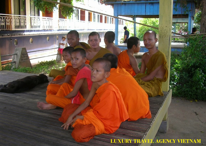 The scenery is very lovely here, and in the distance, forested hills rise. On the river above Phnom Penh there is little shipping, just real Cambodian life. In the afternoon we stop at Peam Chi Kang village to visit the wat or monastery and school.
